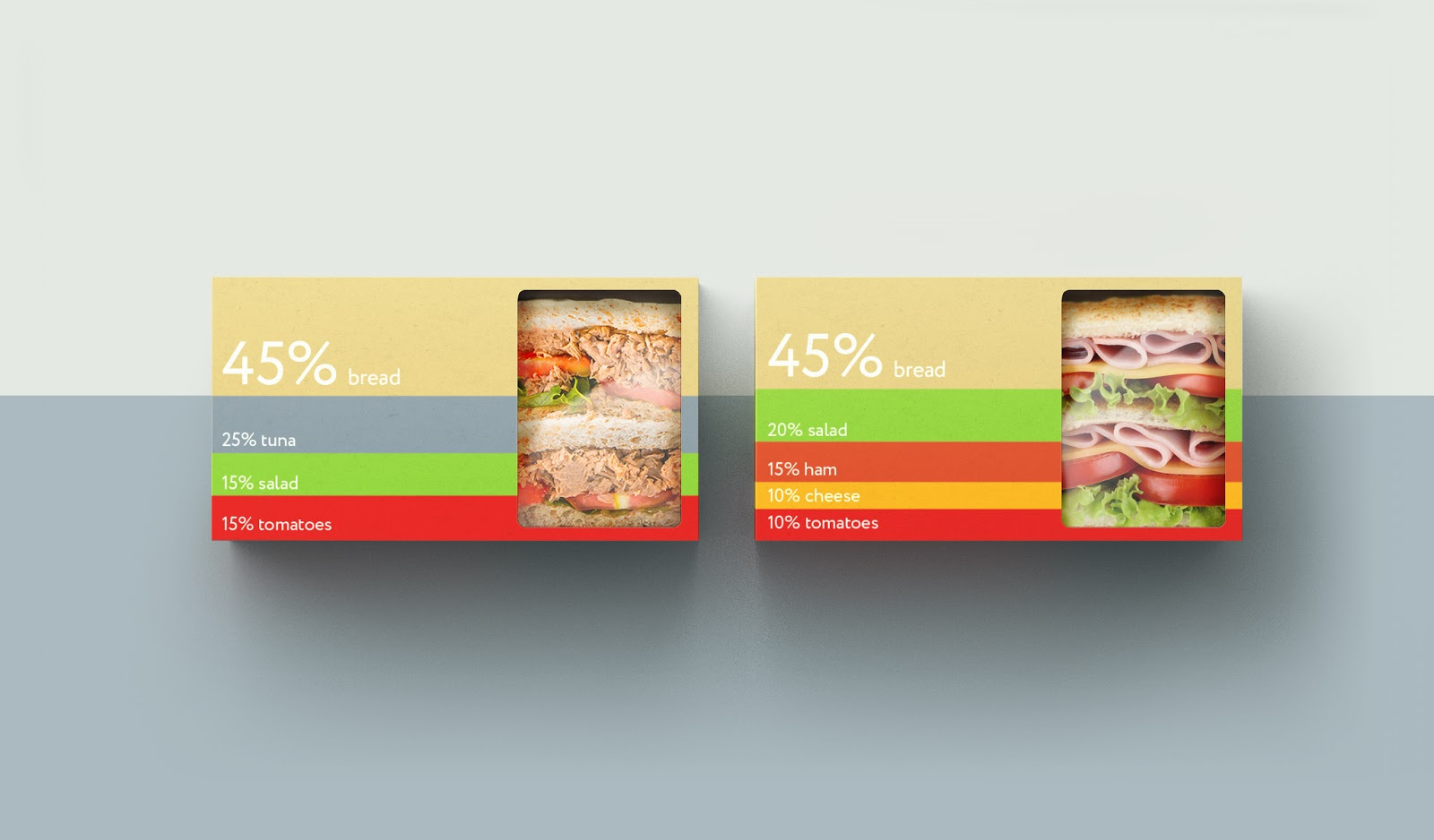 整体设计非常简洁,大胆亮丽的色彩,在包装上还标注了三明治中的营养成分,留白的“视觉窗口”将产品的原料展现在消费者眼前,给消费者创建了很好的触觉体验,使产品更加真材实料,给人留下一种奇特的心理感受。